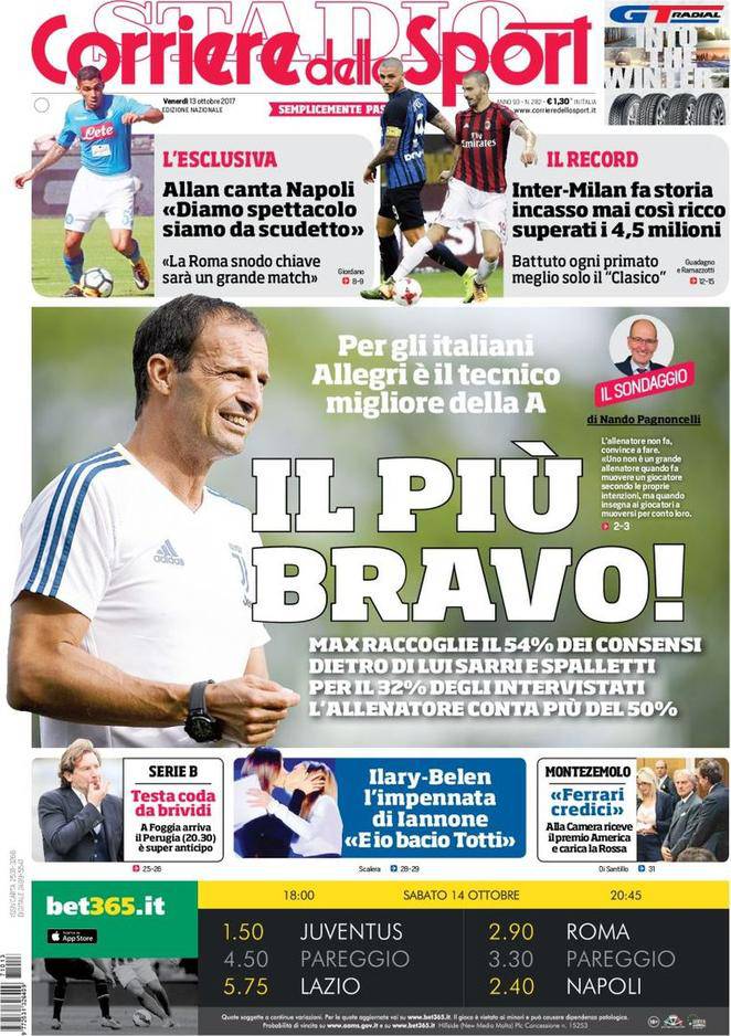 fonte: www.milanlive.it (Corriere dello Sport: prima pagina del 13 ottobre 2017)