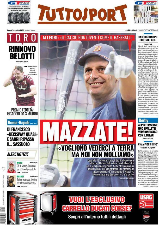 fonte: www.milanlive.it (Tuttosport: prima pagina pagina del 14 ottobre 2017)